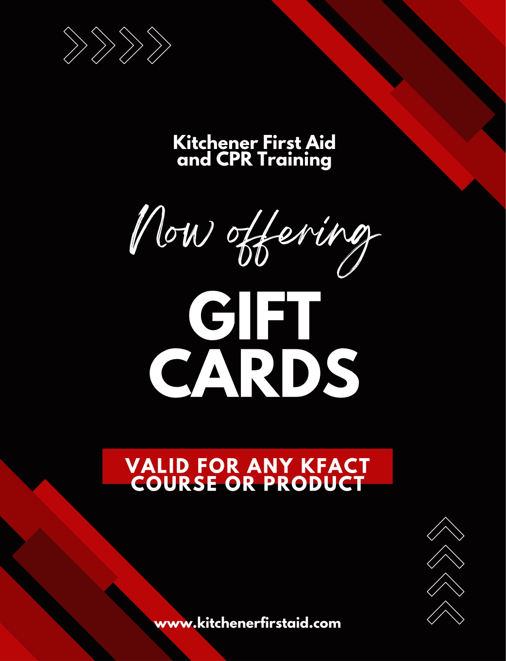 Show someone you care! Gift a loved one a First Aid or CPR course, and we will ensure they have the most exciting and engaging learning experience! Available in multiple denominations, gift cards can be applied to any KFACT course or product in our shop.
